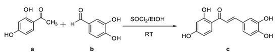 - Hu, Z.; Liu, J.; Dong, Z.; Guo, L.; Wang, D.; Zeng, P. Synthesis of chalcones catalyzed by SOCl2/EtOH. J. Chem. Res. 2004, 2, 158–159. [Google Scholar] [CrossRef]
