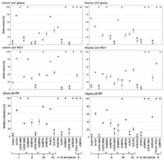 Percentage reduction in cell numbers of Candida biofilm on the surface of glass, polypropylene (PP) and polyethylene terephthalate (PET) in the presence of clove and thyme essential oils; *—no statistically significant reduction in comparison to control; I—C. lusitaniae, II—C. krusei, III—C. boidinii, IV—C. famata, V—C. colliculosa, VI—C. parapsilosis, VII—C. tropicalis, VIII—C. pelliculosa, IX—C. rugosa, X—C. albicans.