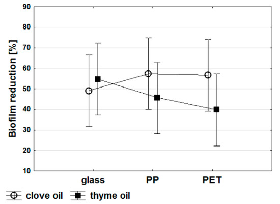 Multivariate analysis of variance (MANOVA) was used to find the manner in which the independent variables (the type of abiotic surface and the type of essential oil) affected the collectively treated set of dependent variables (reduction in biofilm formation by 19 Candida strains tested). On the basis of MANOVA analysis, no statistically significant direct relationship was found between the type of oil, as well as the material and their effect on biofilm formation. However, some dependencies can be determined. Generally, biofilm development was limited more by clove than thyme oil on the surface of PP and PET (Figure 2). Clove oil exhibited the highest antibiofilm efficiency on PP, whereas the lowest on glass. Thyme oil was the most effective in protecting the surface of glass from biofilm formation by Candida sp. (Figure 2). Furthermore, on the surface of glass, both of the oils limited the formation of biofilm in a comparable range. More significant differences (about 10%) concerned the antibiofilm activity of clove and thyme oils on the surface of PP. Whereas, the impact of both oils on biofilm reduction on the surface of PET varied by 15 to 20%. The antibiofilm effectiveness of the essential oils tested can be related to the physicochemical properties of abiotic materials, since microbial adhesion preferably occurs on hydrophobic surfaces than on hydrophilic ones with lower contact angles. Polymers, such as PP or PET with a higher contact angle (108° and 103°, respectively), are more hydrophobic than glass (38.5°) [15,16]. Another important factor can be substratum surface roughness, which enhances the rate of biofilm adhesion when increased. Glass is characterized by very smooth surface and higher ease of the relative biofilm removal when compared to polymers [16].