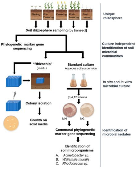 Sampling of soil and the subsequent use of an array of standard culture techniques has traditionally been used to isolate soil microbes, some of which have proven to be functionally useful. However, an enhanced understanding of the interactions that exist between plants and their microbial partners will allow researchers to select more appropriate sampling criteria for these partners. The rhizosphere, the region of soil immediately surrounding the roots, is considered the next frontier in chemical ecology [57] and it has been recognised that knowledge about microbiome interactions (signalling/inhibition/syntrophy) is critical to improve the understanding of rhizosphere functions, responses and properties [58]. These remain largely unexplored because of the magnitude of microbial diversity, and the difficulty encountered in recovering and culturing soil microbiota [59].