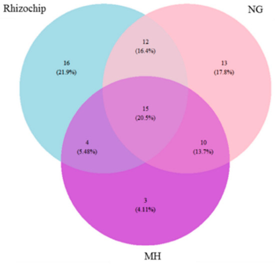 Venn diagram demonstrating unique and shared operational taxonomic units (OTUs) between three microbial isolation methods at the order level featuring the rhizochip and solid media NG (gellan gum) and MH (Mueller Hinton).