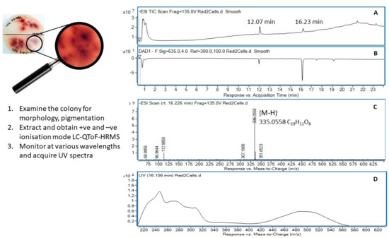 Colony ID 240 was identified as the Gram positive Actinobacterium Williamsia muralis str. 9571414 (99.9%) based on 16S rRNA analysis. Williamsia muralis isolated from the rhizosphere soil was characterised by smooth pink pigmented colonies (Figure 5) that grew well on 2% gellan gum containing nutrient broth media and in nutrient broth liquid culture. Centrifugation of the liquid culture provided a pellet of pink cells that were immediately extracted in 95% ethanol to return a light yellow solution with the pink pigment remaining unextracted in the cellular suspension. Filtration followed by removal of the solvent under a stream of nitrogen at 35 °C produced a yellow gum that was taken up in acetonitrile (2 mL) and subjected to UHPLC-DAD-QToF-MS analysis.