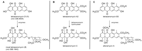 (A) Proposed metabolites (1) and (2) produced by Acinetobacter sp.; (B) transformation involving the conversion of tetracenomycin A2 to tetracenomycin C [48]; (C) transformation involving the conversion of tetracenomycin B3 to elloramycin A [47].