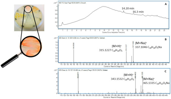(A) Williamsia muralis str. 9571414, positive ion (+ve) TIC chromatogram from C18 reverse phase chromatography; (B) Mass spectrum (+ve ion) of the compound eluting at 14.2 min; (C) Mass spectrum (+ve ion) of the compound eluting at 16.3 min.