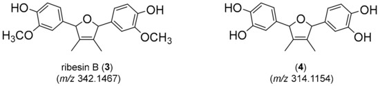 Consideration of the molecular formulae for the two metabolites identified in Figure 5B/C suggested they were analogs, differing by two methylations on the higher mass molecule (m/z 342) compared to the lower mass molecule (m/z 314). This assertion was supported by the major fragment ion observed in each occurring at m/z 163 and m/z 149 respectively, supporting a homodimeric structure. An extensive review of the chemical literature cross referencing these data identified the antioxidant ribesin B (3) [49], a 7,7′-epoxylignan from the plant Ribes nigrum (black currant) as a plausible structure for the molecule eluting at 16.3 min with m/z 342. This necessitated the molecule eluting at 14.2 min with m/z 314 to be the desmethyl analog 4 (Figure 6).