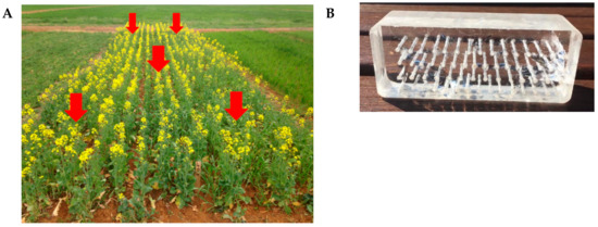 Locations of rhizochips within the canola plots with red arrows pointing to sites of burial (A) and representative image of the rhizochip with predrilled micro-chambers (B).