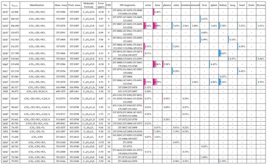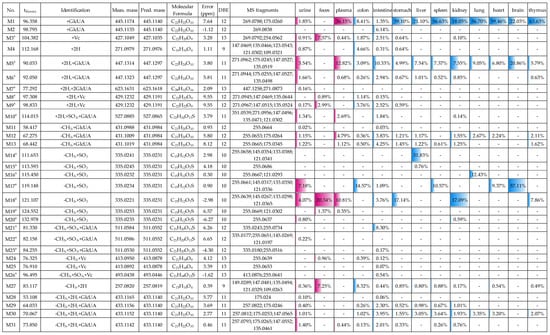 Organ samples: After collecting blood via cardiac puncture, the heart, liver, spleen, lungs, kidneys, colon, intestine, stomach, brain, thymus were rapidly removed and washed three times with cold saline to flush away the surface blood and other residual substances. Later, they were preserved at −80 °C after drying with filter papers. Then, each kind of the organs from the same group were combined and weighed, as well as added 5 times volumes of methanol (5 mL methanol/g tissue). The mixture was homogenized by a T10 homogenizer (IKA Co., Ltd., Staufen, Germany) under low temperature conditions, and ultrasonically extracted by a KQ-2200B ultrasonic cleaning machine (Kunshan Ultrasonic Instruments Co., Ltd., Jiangsu, China) for an hour and then centrifuged at 2292× g (5000 rpm) at 4 °C for 15 min. Additionally, the supernatant was concentrated and dried in a vacuum at 40 °C, reconstituted with 10 times volume of methanol, and maintained at −80 °C. And, before LC-MS analysis they shall be filtered through 0.22 μm membranes.