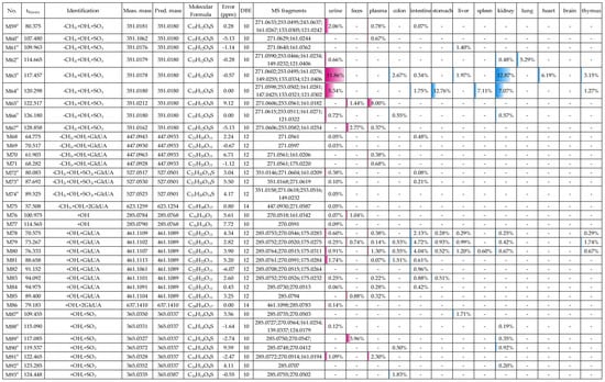 The distribution of 165 metabolites (including 104 metabolites in urine, 29 metabolites in feces, 38 metabolites in plasma, 41 metabolites in the colon, 74 metabolites in the intestine, 28 metabolites in the stomach, 24 metabolites in the liver, 15 metabolites in the spleen, 42 metabolites in the kidney, 8 metabolites in the lung, 10 metabolites in the heart, 3 metabolites in the brain and 17 metabolites in the thymus) of medicarpin and their relative contents in each biological sample are shown in Figure 14. The relative content of a metabolite in each biosample was calculated by (peak area of a metabolite in the sample/total peak area of all metabolites detected in the sample) × 100%. The peak area of a metabolite was calculated from its extracted ion chromatogram.