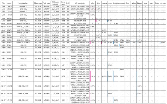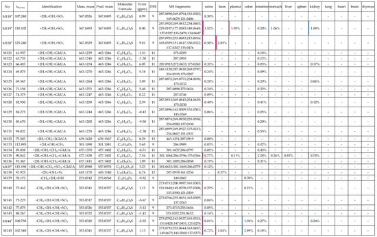 From Figure 14, we could find that: (1) in urine, M159 (12.68%, dihydroxylated medicarpin sulfate), M63 (11.86%, demethylated and hydroxylated medicarpin sulfate), M17 (7.18%, demethylated medicarpin sulfate), and M64 (5.34%) were four major metabolites and all of them were sulfates; it is an interesting phenomenon that sulfates other than glucuronides are major metabolites in urine, and the cause is unclear; (2) in feces, M18 (20.34%), M43 (10.35%), M34 (9.89%), M40 (8.86%), M3 (7.57%, Vc conjugate), and M27 (7.25%) were six major metabolites with a relative content higher than 5%, and three of them (M43, M34, M40) were demethylated and hydrogenated medicarpin sulfates; (3) in plasma, M1 (36.15%, medicarpin glucuronide), M5 (12.82%, vestitol-1’-O-glucuronide), M18 (10.81%), M65 (8.00%),and M40 (5.58%) were major metabolites; (4) M1 was the most abundant metabolite in the stomach, liver, spleen, kidney, lung, heart, and thymus. M5, M14 (demethylated medicarpin) were the most abundant metabolites in intestine and liver, respectively. M17 (demethylated medicarpin sulfate) was the most abundant metabolite in the colon and brain; (5) M1, M5 were detected in all 10 organs; M30 (demethylated and hydrogenated medicarpin glucuronide) was detected in nine organs (except the brain); M12 and M27 were detected in eight organs; therefore, these five metabolites were widely distributed in vivo. Considering the high abundance and wide distribution, we suggest that the bioactivities of these metabolites deserve further research in order to fully explain the pharmacological action mechanism of medicarpin. In addition, the reason for specific distribution of some metabolites (e.g., M2, M14, M20, M35, M40, M54, M109) also need further investigation.