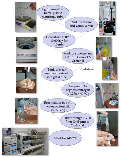 With the aim to develop a new LC-MS/MS method for the simultaneous determination of both compounds in one step, in this study different conditions were tested. So, the development of the method included the comparison of different sources for ionization (ESI—electrospray ionization; APCI—chemical ionization under atmospheric pressure), the usage of different types of gradients and mobile phases (water acidified with formic and acetic acid, and acetonitrile), the use of different types of extraction (aqueous and methanolic) and methods of sample preparation (single and multiple extraction, with or without concentration, and with or without purification with the SPE (Solid Phase Extraction) columns). Finally, the single LC-MS/MS method was developed for analysis of both analytes within 20 min using simple single step extraction. The obtained method is described in the section Materials and Methods and is illustrated in Figure 1.