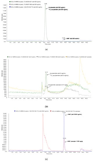 Chromatograms of the: (a) standard solution of acrylamide, 13C3-acrylamide and HMF (500 ng/mL); (b) standard solution of acrylamide and 13C3-acrylamide (5 ng/mL) and extruded sample with detected 2.01 ng/g of acrylamide; (c) standard solution of HMF (2500 ng/mL) and extruded sample with detected 1180 ng/g of HMF.