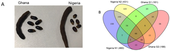 (A). Pictorial presentation of the phenotypic characteristics of Xylopia aethiopica fruits and seeds from Ghana and Nigeria. (B). Venn diagram presentation of protein distribution including common proteins identified in the seeds of X. aethiopica from Nigeria and Ghana. Proteins extracted from seeds were digested, analyzed using nano-LC-MS/MS, and identified based on protein ID number.