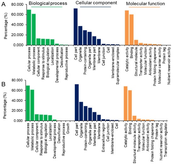 Functional analysis of significantly changed proteins between the seeds of X. aethiopica from Ghana and Nigeria. (A) Functional categorization of significantly changed proteins was analyzed using GO database with blast2go v4.5 pipeline software. (B) The molecular function of significantly changed proteins was analyzed using Clusters of Orthologous Groups of Proteins System (COG, http://www.ncbi.nlm.nih.gov/COG/).