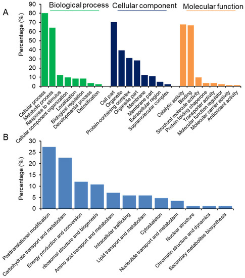 With respect to the significantly changed proteins, aside from their broad functional categorization (biological process, cellular component, and molecular function), they are involved in a wide array of activities at the molecular function level. These activities range from posttranslational modification and carbohydrate transport to secondary metabolites biosynthesis (Figure 3).
