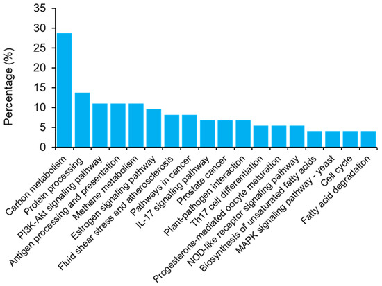 KEGG pathway enrichment analysis of the significantly changed proteins revealed differences in 18 pathways ranging from carbon metabolism to fatty acid degradation (Figure 4). In summary, these pathways throw light on the various processes relating mainly to the biosynthesis and metabolism of amino acids. The differential expressions of these pathways by the samples from the two countries could be indicative of the possible influence of the location of cultivation and the growth conditions inherent therein. For instance, using the common pathway, carbon metabolism, the differential levels expressed by the samples suggests either varying levels of CO2 or significant differences in utilization of the CO2 during photosynthesis or the combination of both [23]. Either way, it points to the differential expressions and regulations of the genes involved in carbon metabolism and photosynthesis [24].