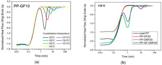 Isothermal crystallization experiments for neat PP and the corresponding composites were performed at different temperatures ranging from 125 to 150 °C. The exothermic curves representing the crystallization of the samples were recorded as a function of time (Figure 1a—only the PP–GF10 sample is presented for brevity reasons), while Figure 1b shows a comparative plot of neat PP, PP–GF20, PP–GNP20 and PP–GF–GNP20 composites at 135 °C. The curves shifted to lower values with a decreasing isothermal crystallization temperature, indicating that the crystallization rate was significantly increased.