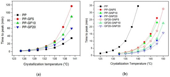 Dependence of the time to peak on the temperature of isothermal crystallization from the melt for (a) PP–GF and (b) PP–GNP and PP–GF–GNP composites.