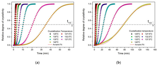 Avrami fit (continuous line) for the data (solid symbols) from the isothermal crystallization of (a) neat PP and (b) PP–GF10 composite.