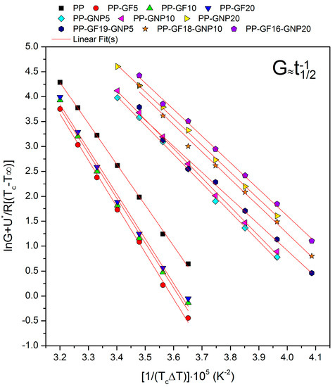 Plotting the left-hand side of Equation (5) versus 1/Tc(ΔΤ)f most commonly gives a straight line with a slope and intercept equal to the nucleation constant –Kg and G0, respectively. The Lauritzen–Hoffman plots for PP and the composites can be seen in Figure 4 and it is obvious that the experimental data are successfully fitted with a linear fitting procedure.