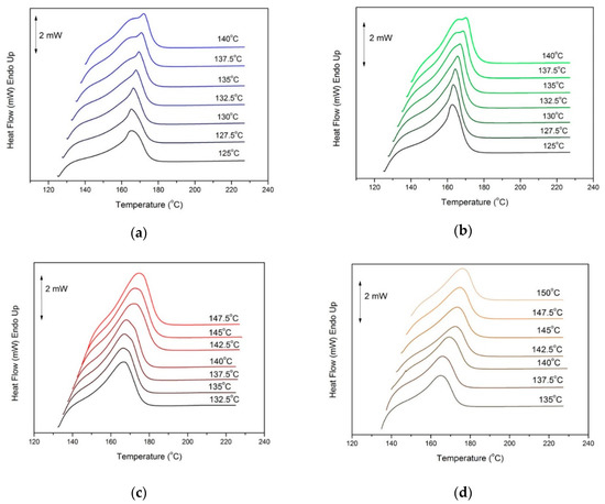 Melting traces of (a) PP, (b) PP–GF10, (c) PP–GNP5, and (d) PP–GF18–GNP10 composites after isothermal crystallization at various temperatures.