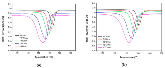 Differential scanning calorimeter (DSC) non-isothermal crystallization exothermic peaks recorded at different cooling rates for (a) PP and (b) PP–GNP10 composite.