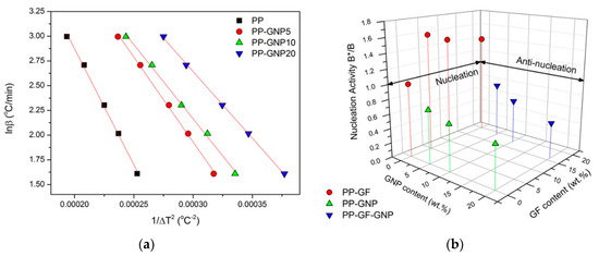 where A is a constant and B and B* are the constants related to the homogeneous and heterogeneous nucleation. If the nucleating substance is extremely active, the nucleation activity (B*/B) will be close to zero, while if it is inert, the nucleation activity will be close to unity. Hence, when the nucleation activity values are higher than 1, this fact indicates an anti-nucleation effect of the filler. Plots of lnβ versus 1/(ΔTp)2 are shown in Figure 8a for the PP–GNP samples, while the results for the nucleation activity are presented in Figure 8b. GNPs in the PP–GNP sample with their large surface area provide increased nucleation activity on the composite samples, which increases with increasing filler content. On the contrary, PP-GFs composites exhibit values of nucleation activity higher than 1, indicating once again their anti-nucleation effect on the PP matrix. Finally, the samples filled with the filler mixture of GF–GNP exhibit a B*/B ratio very close to their PP–GNP counterparts, signifying that the GF in the specific samples are almost inert during the crystallization from the melt and the GNPs are responsible for creating enough surface to initiate crystallization faster at higher temperatures than the matrix. The high nucleation activity of GNP prevailed despite the high GFs content, and the crystallization rates were significantly enhanced under all conditions compared to the matrix. Interestingly, the crystallization rates in the specific set of samples were slightly higher (1–3 °C) than those observed for PP–GNP samples, even though the GFs should not contribute to the specific phenomenon, from previous observations. Most possibly a de-agglomeration occurred due to the increased shear stress between the various particles (loadings ranging from 24–36 wt.%) and a relatively homogeneous distribution of GNPs enabled higher rates of crystallization. Furthermore, the high interconnectivity of GFs [45] may have enabled the formation of a filler network, which is known to act positively towards the increase in the crystallization rates.