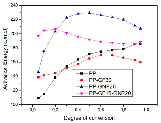 Dependence of the activation energy on the degree of conversion as calculated with Friedman’s method for neat PP, and PP–GF20, PP–GNP20, PP–GF16–GNP20 composites.