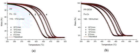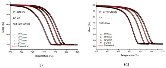 A competitive effect between GFs and GNPs was found for the PP–GF–GNP composite since GFs tend to decrease the thermal stability, while GNPs act towards the increase in the decomposition temperature [15]. A further detailed investigation is needed in order to investigate the reactions which take place during the decomposition process and the mechanisms which describe them. For performing kinetic computations on thermal analysis data, the composites filled with the highest filler content were selected (PP–GF20, PP–GNP20, PP–GF16–GNP20) along with the neat PP. For each sample, four runs were conducted with each one at a different heating rate (5, 10, 15 and 20 °C/min) [46].
