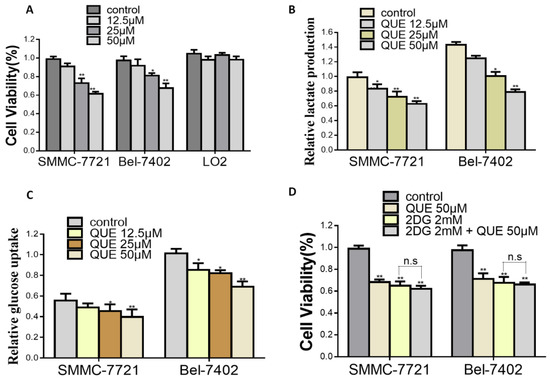 Previous research has shown that decreased glycolytic metabolism in breast and in Dalton’s lymphoma can cause the reduced progression induced by QUE [14,20,21]. Although the anticancer properties of QUE are well known, the relationship between QUE and cancer metabolism is poorly understood, including the role of key metabolic enzymes such as HK2. In the present study, we have shown that antiproliferative effects of glycolytic inhibitors(2DG) were not enhanced when the aerobic glycolytic HCC cells were treated together with QUE (Figure 1D), indicating that cell growth inhibition was probably correlated to QUE-inhibited aerobic glycolysis. In addition, we also found for the first time that the glycolysis and growth of HCC cells were significantly inhibited with the decrease of HK2 after QUE treatment (Figure 2A,B). Further studies have shown that the suppression induced by QUE was substantially weakened after overexpression of HK2, suggesting HK2 is essential for QUE to exert its activity in HCC (Figure 2C–E).