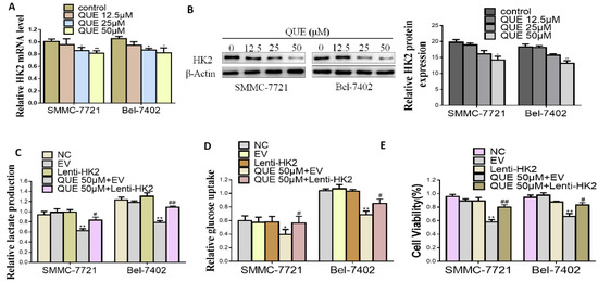 HK2, which participates in cell growth regulation and is unregulated in multiple cancers, is the first important rate-limiting enzyme in glycolysis [9]. Next, we measured whether QUE had any influence on the expression of HK2 in HCC cells by quantitative reverse-transcription polymerase chain reaction (qRT-PCR) and Western blotting assays. As shown in Figure 2A,B, after QUE treatment, HK2 mRNA and total protein expression level significantly decreased in a dose-dependent manner. To further study the role of HK-2 played in QUE-mediated activities, SMMC-7721 and Bel-7402 cells stably overexpressing HK2 (Figure S1) were treated with QUE, which significantly attenuated its inhibitory effect on glucose uptake, lactate production and cell proliferation. As shown in Figure 2C,D, analysis of hallmarks of glycolysis showed that the inhibitory effect of QUE was totally decreased in HK2 overexpressing groups rather than in empty vector (EV) groups. The same was true for cell proliferation rate (Figure 2E). Altogether, the results demonstrate that HK2 is critical for the QUE-inhibited glycolysis and cell proliferation in HCC cells.