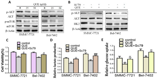 In order to further determine the mechanism of QUE modulation of HK2 expression level, we focused on the Akt-mTOR pathway, which regulates a wide variety of cellular processes including cancer cells glucose metabolism [25,26]. As shown in Figure 3A, compared with the control group, QUE treatment effectively inactivated the Akt-mTOR pathway by inhibiting the rates of p-Akt /AKT and p-mTOR/mTOR. To further clarify whether the Akt-mTOR pathway was involved in the inhibition of HK2 by QUE, Akt phosphorylation activator (SC79, a compound for research tool) were used (Figure 3B) [27]. As shown in Figure 3C–E, SC79 treatment attenuated QUE-inhibited HCC cell proliferation (Figure 3C) and reversed the glycolysis inhibitory effect of QUE (Figure 3D,E). Furthermore, HK2, the rate-limiting enzyme catalyzing the first important irreversible step of glycolysis were dramatically elevated, suggesting that the disruption of Akt-mTOR pathway is responsible for HK2 expression and resulted in HCC glycolysis and proliferation inhibitory effect of QUE.