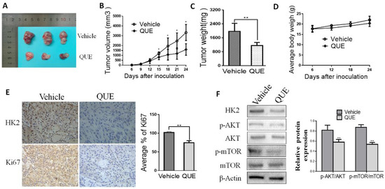 According to the results of in vitro experiments, we have further studied the effects of QUE on the growth of tumors and the expression of HK2 by using a human HCC xenograft. Giving 5-week-old female nude mice a subcutaneous injection of SMMC-7721 cell lines created a xenograft mouse model, as mentioned previously [28]. Our results showed that QUE significantly reduced the size of tumors in a SMMC-7721 xenograft model (Figure 4A–C). Weights of all mice increased normally among vehicle control or QUE group (Figure 4D) Moreover, immunohistochemical and Western blot analyses of QUE treated SMMC-7721 xenograft tumors was performed to determine the expression level of HK2. Data showed that HK2 were remarkedly down regulated in the QUE treated group rather than in the vehicle group (Figure 4E,F). As a well-known marker of cell proliferation potential, Ki-67 was also detected by immunohistochemistry staining. As shown in Figure 4E, compared with the Ki67 in the vehicle group, Ki67 in QUE group was substantially decreased. Furthermore, we found that phosphorylated Akt and mTOR was dramatically inhibited in QUE treated group (Figure 4F). The above results clearly indicate that QUE suppresses the progression of HCC by inhibiting HK2 mediated glycolysis in vivo.