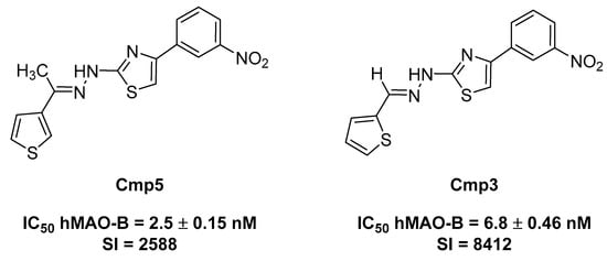 However, in the paper of Gabilondo et al. [], it was reported that a remarkable and selective increase in MAO-B activity is also detected in human gliomas. This could be explained by an augmented number of astrocytes as well as a higher content of MAO-B in tumoral astrocytes with respect to normal ones [], highlighting that the overexpression of MAO-B could be related with high-grade glioma, and thus defining MAO-B as a promising target for the development of novel therapies for cancer. To better understand the role played by MAO-B inhibitors in the treatment of glioma, the aim is to evaluate two newly synthesized compounds, namely Cmp3 and Cmp5 (Figure 1) [], along with two approved selective MAO-B inhibitors (deprenyl and safinamide). These compounds were the best-in-class derivatives, within the hydrazothiazole scaffold, endowed with a potent and selective hMAO-B inhibition in the low nanomolar range comparable to the clinically used drugs. The Selectivity Index (SI) was expressed as IC50 hMAO-A/IC50 hMAO-B. They were shown to act as reversible and competitive inhibitors. We also assessed the in vitro stability of pH and temperature in forced conditions [].