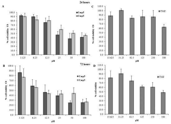 MTT cell viability assay on C6. (A,B) Histograms represent the viability dose-response of C6 cells exposed to different concentrations of Cmp3 and Cmp5 (from 3.125 to 100 μM) for 24 h and 72 h. (C,D) Histograms represent the viability dose-response of C6 cells exposed to different concentrations of TMZ (from 15.636 to 500 μM) for 24 h and 72 h. Proliferation was assessed using MTT assay and normalized to control cells treated with DMSO (0.2% as final concentration).