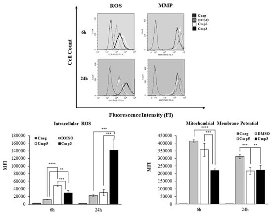 After longer experimental times (24 h), Cmp3 retains a consistent and significant disturbance of the MMP, in respect to the DMSO sample, being Mean Fluorescence Intensities (MFIs) assessed at 2.23 × 105 (Cmp3) and 3.13 × 105 (DMSO). In parallel, Cmp5 considerably lowers MMP if compared to 6 h exposure, revealing values comparable with those registered for Cmp3 (MFI of Cmp5 = 2.18 × 105) (Figure 6).