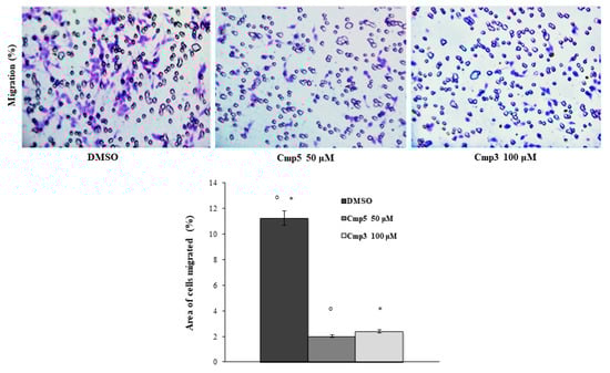 The C6 cell migration was evaluated by means of a 24-well Transwell Boyden chamber containing 8 µm pore size membranes (Corning, Lowell, MA, USA). For this purpose, suspended C6 rat glioma cells were separately treated with 50 µM Cmp5 and 100 µM Cmp3 in serum-free Ham’s F12 at cell density of 50,000/150 μL, and then added to the upper chamber of a 8 μm pore size insert. Ham’s F12 supplemented with 10% FBS was added to the lower chamber as a chemoattractant and allowed to migrate towards a 10% FBS containing medium present in the lower chamber. Cells were incubated for 24 h at 37 °C, the non-migrating cells on the upper chamber were then removed with the aid of a cotton swab, whereas the cells migrated to the lower surface of the membrane were stained with crystal violet for 10 min at room temperature. Images were captured at 20x magnification with a light microscope (Leica DM 4000, Leica Cambridge Ltd., Cambridge, UK) equipped with a Leica DFC 320 camera (Leica Cambridge Ltd.). Images were analyzed by means of Leica Application Suite–X (LAS-X) analysis software. The migration rate was calculated as the area covered by stained cells, given that they represent the migrated cells.