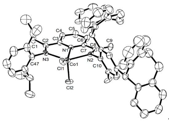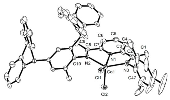 All the organic compounds and cobalt precatalysts mentioned above were characterized by FT-IR spectroscopy, NMR spectroscopy and elemental analysis. The representative complexes Co3 and Co4 were the subject of single-crystal X-ray diffraction analysis. In the FT-IR spectra of the complexes, the wavenumbers corresponding to the stretching vibrations of the C=Nimine bonds observed in the range of 1624–1625 cm−1 are lower, comparing with the respective ligands (1640–1649 cm−1). This finding reveals the effective coordination of the metal center and the ligand donor atoms, as reported earlier [36,46]. The 1H-NMR spectra of the cobalt precatalysts were recorded in deuterated dichloromethane CD2Cl2 at ambient temperature (see Supporting Information, Figures S1–S5). The characteristic peaks were assigned by comparison with the spectra of related bis(imino)pyridyl precatalysts [18,56,57]. Each spectrum reveals the unsymmetrical nature; for example, Co1 shows two distinct signals for the m-pyridyl protons, which appear downfield with the chemical shifts of 113.26 and 110.26 ppm, respectively; each with the relative area of 1 and the p-pyridyl proton with the chemical shift of 37.57 ppm and the area of 1. Moreover, the peaks for the methyl groups attached to the aryl rings at the ortho-position were observed upfield with chemical shifts of −25.35 to −29.44 ppm and the acetyl protons downfield at 1.22 to 1.54 ppm, respectively; each with an area of 3. The remaining spectra are similar; for example, in Co4 and Co5, distinct peaks are observed for the methyl protons attached to the aryl ring at the para-position with the chemical shifts of 17.56 and 18.63 ppm, respectively. The elemental analysis of all ligands and complexes was consistent with their formulae. In addition, the molecular structure of Co3 and Co4 were determined by single-crystal X-ray diffraction analysis.