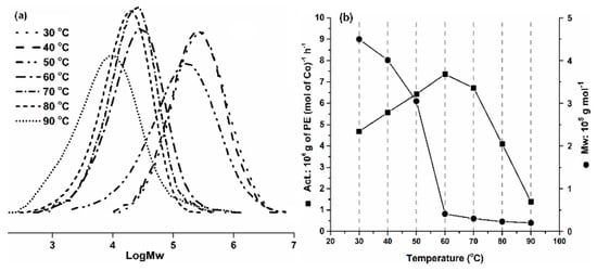 GPC curves of the obtained polyethylene (a); activity and Mw as a function of reaction temperature (b) for the Co1/MAO system (Table 3, entries 1–7).
