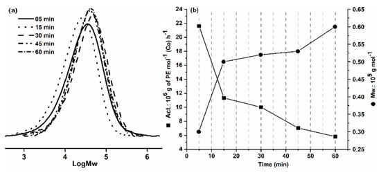 GPC curves of the obtained polyethylene (a); activity and Mw as a function of reaction time (b) for the Co1/MAO system (Table 3, entries 11 and 14–17).