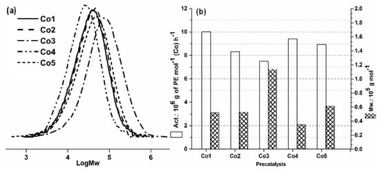 GPC curves of the obtained polyethylene (a); activity and Mw as a function of the Al/Co ratio (b) for the Co1/MAO system (Table 3, entries 4 and 8–13).