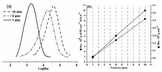GPC curves of the obtained polyethylene (a); activity and Mw as a function of ethylene pressure (b) for the Co1/MAO system at the optimized reaction conditions (Table 3, entries 11, 18 and 19).
