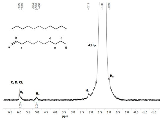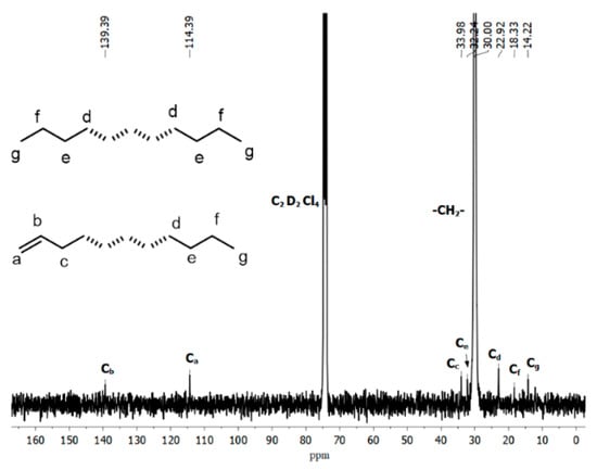 The 1H-NMR spectrum (Figure 8) reveals the coexistence of polyethylene bearing both saturated and unsaturated end groups. However, the exact ratio of both polymer types is unclear due to overlapping peaks. Vinyl end groups (–CH=CH2) were identified as two multiplets around 5.86 and 5.03 ppm with the relative peak area of 1 and 2. High intensity singlet at around 1.38 ppm corresponding to the protons of the –(CH2)n– mers and another signal at 2.13 ppm due to the protons adjacent to the vinyl group (Hc) were observed. The signal of the methyl group (Hg) at 0.99 ppm overlaps with the –(CH2)n– band; therefore the exact ratio of unsaturated to saturated end groups cannot be determined. The NMR spectra suggest a highly linear structure of both saturated and unsaturated polyethylene. The presence of the vinyl end group was further confirmed by the 13C-NMR spectrum (Figure 9), in which two distinct peaks belonging to the vinyl carbon atoms located at the end of the polymer chain (Ca and Cb) were detected at 114.39 and 139.39 ppm, together with the peak corresponding to the adjacent carbon atom (Cc) at 33.93 ppm. The signal of the –(CH2)n– mers was recorded at 30.00 ppm. The carbon atoms of the methyl group at the saturated end of the macromolecule were observed at 14.22 ppm (Cg), along with the carbon atoms located at the close vicinity (Cd, Ce, and Cf) at 32.24, 22.92 and 18.33 ppm, respectively [38,39,45,64,65,66].