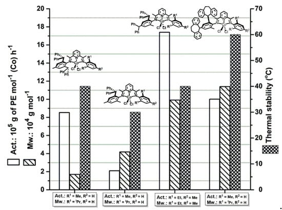 The comparison of the precatalyst investigated in this work with the previously reported cobalt systems [39,42,45] shown in Figure 10 reveals several interesting trends. The unprecedented thermal stability observed for the current system highlights the potential of the dibenzocycloheptyl substituent introduced in this work. Comparing with the catalysts reported before, polyethylene of the highest molecular weight was obtained due to the bulkiness that prevents chain transfer by protecting the active sites; this finding is consistent with the literature [33,36]. Interestingly, the catalytic activity is not impaired significantly and the current system is able to outperform several precatalysts with the benzhydryl substituents attached to the aryl rings [39,42].