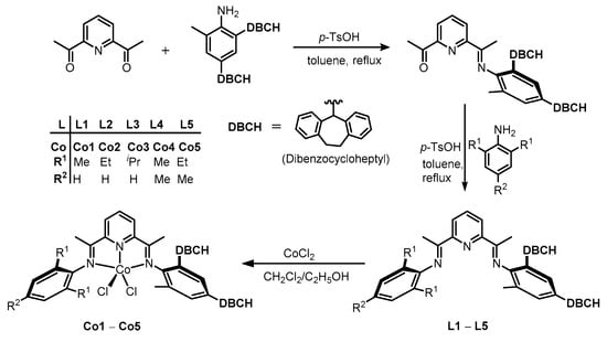 2,4-bis(Dibenzocycloheptyl)-6-methylaniline is prepared in a good yield according to the literature method [51,52,53,54,55]. The condensation reaction with one molar equivalent of 2,6-diacetylpyridine generates the monoketone derivative, 2-acetyl-6-(1-(2,4-bis(dibenzocyclo- heptyl)-6-methylphenylimino)ethyl)pyridine. Subsequent reactions with the corresponding anilines lead to a series of 2-(1-(2,4-bis(dibenzocycloheptyl)-6-methylphenylimino)ethyl)-6-(1-(arylimino)- ethyl)pyridine ligands (L1–L5); {aryl = 2,6-Me2C6H3 (L1), 2,6-Et2C6H3 (L2), 2,6-iPr2C6H3 (L3), 2,4,6-Me3C6H2 (L4) and 2,6-Et2-4-MeC6H2 (L5)}. Upon treatment with CoCl2, the corresponding precatalysts Co1–Co5 are obtained (Scheme 2).