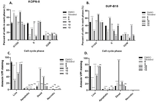Analysis of apoptosis and cell cycle of compounds 8–10, 12, and 13 by Annexin V/Propidium Iodide (PI) flow cytometry assay after 24 h treatment using KOPN-8 and SUP-B15 cellular models. Negative control (DMSO), positive control (silvestrol, 5 μM), compounds 8 (5 μM), 9 (10 μM), 10 (5 μM), 12 (10 μM), 13 (10 μM). A. KOPN-8. B. SUP-B15. C. Annexin V/PI of KOPN-8. D. Annexin V/PI of SUP-B15. Bars depict mean and SD of at least three independent experiments. **** p < 0.0001, *** p < 0.0004, ** p < 0.0086, * p < 0.025 and ns (no statistical significant) according to Tukey’s test when compared to DMSO control.