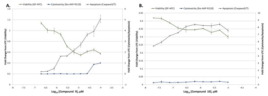 The ApoTox-Glo triplex assay against SUP-B15 to determine viable cells (using GF-AFC as fluorescent readout), apoptotic cells (caspase 3/7Glo as luminescent readout) or cytotoxicity by membrane integrity (bis-AAF-RF110 as fluorescent readout) upon compound treatment for 36 h. A. compound 9 (0.2–100 µM). B. compound 10 (0.02–10 µM). Graphs show decrease in cell viability, while increasing apoptotic activity with little cytotoxic effects by membrane integrity evaluation under the evaluated conditions (time and concentration).