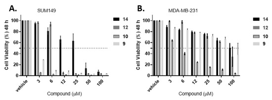Propidium iodide (PI) assay of compounds 9–10, 12 and 14 after 48 h treatment against breast cancer cell models to determine apoptotic effects. A. SUM-149, and B. MDA-MB-231. Bars represent mean ± SEM of at least three biological replicates.