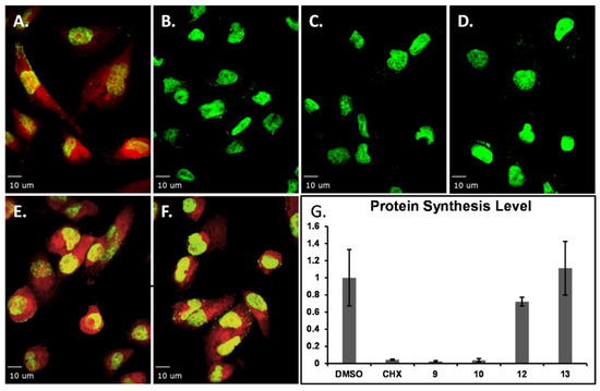 Protein synthesis is essential in cell growth, proliferation, signaling, differentiation, and death [32]. To interrogate whether the compounds inhibited protein synthesis as nascent proteins are generated, protein synthesis levels were monitored using a commercially available kit (EZClick™ Global Protein Synthesis Assay Kit). The assay includes a robust chemical method based on an alkyne containing o-propargyl-puromycin probe, which stops translation by forming covalent conjugates with nascent polypeptide chains. Truncated polypeptides are rapidly turned over by the proteasome and can be detected based on the subsequent click reaction with a fluorescent azide [33]. To test whether these compounds (4–14) induced de novo protein synthesis inhibition, compounds were tested for a 2 h exposure time, under the same conditions as the known protein synthesis inhibitor cycloheximide (CHX) in MDA-MB-231 cell model following an in-cell-click de novo protein synthesis assay [33,34,35]. Partial protein synthesis inhibition was observed for compound 4 (Supplementary Material, Figure S9), and compounds 7–8 showed no inhibition (data not shown). The results show that compound 9 inhibits protein synthesis at 10 µM while compound 10 inhibits de novo protein synthesis at lower concentrations (1–5 µM, higher concentrations induce immediate cell detachment) under these experimental conditions (Figure 6A, B). Compounds 12 and 13 showed little to no protein synthesis inhibition, as shown in Figure 6E–G along with their relative quantification. The remaining compounds (11 and 14) showed no protein synthesis inhibition.