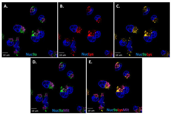 It is important to determine the intracellular accumulation of compound 9 as this may aid in identifying its intracellular interactions. To facilitate these experiments, a series of orthogonal fluorescent organelle markers were used for co-localization studies. The organelle marker set included indicators for the lysosome (Lysotracker Red), the mitochondria (MitoTracker Deep Red), and the endoplasmic reticulum (ER tracker Blue/White). Where applicable, nuclei were stained with Hoechst (Blue). All these markers were compatible with BODIPY-FL (green) to allow for flexible combinations. The MDA-MB-231 adherent cellular model was used for the live cell co-localization studies as this cellular model displays well-defined organelle morphologies that can be consistently and positively identified [37]. First, to evaluate the accumulation of compound 9a after 30 min treatment at 1 µM, washout experiments were conducted as shown in Figure 7A in the presence of Hoechst nuclear stain. Distinct green specks were observed near the nucleus of the cell. A similar observation was made using lysosome tracker (red, Figure 7B) and merging of both images clearly shows co-localization, observed as yellow (Figure 7C). Next MitoTracker-Deep Red (purple) was evaluated (Figure 7D) but no co-localization was detected with probe 9a as seen by the absence of white staining in the merged image. This demonstrates that probe 9a co-localizes with lysosomes, but not with mitochondria inside the cell (Figure 7E).