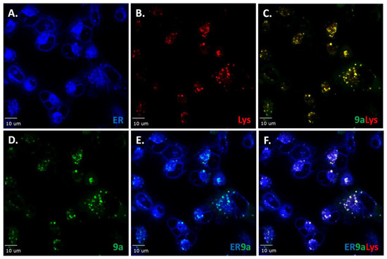Representative images of co-localization studies of probe 9a with organelle fluorescent stains in live cells. A. ER tracker Blue/White (blue). B. Lysosome tracker (red). C. Merged image of lysosomal and probe 9a staining. D. Probe 9a (2 µM, green). E. Merged image of ER tracker and probe 9a staining. F. Merged image of ER tracker, Lysosome tracker and probe 9a staining. Scale bar: 10 μm.